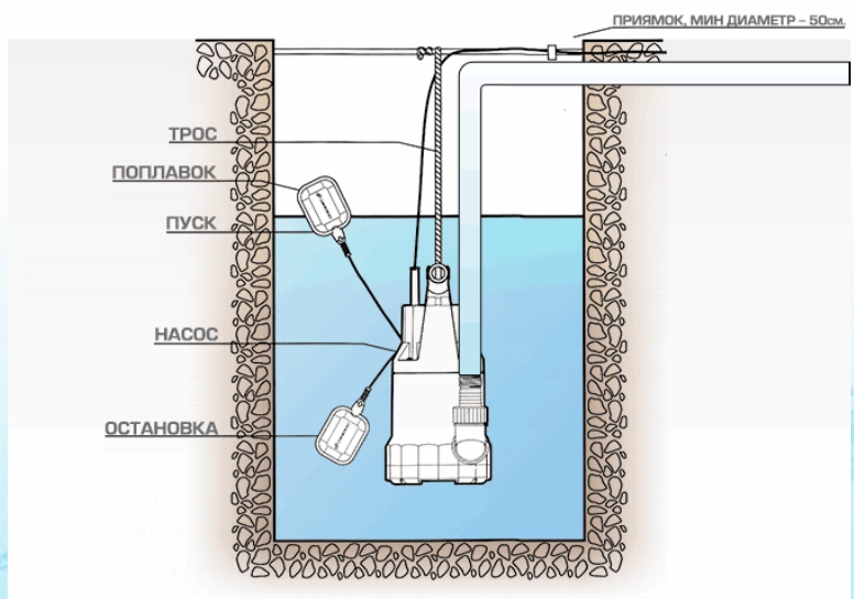 Les pompes sont installées à côté des puisards. Ils ne sont pas immergés dans l'eau, les unités sont donc de faible puissance. Un tuyau est descendu dans la fosse elle-même, qui va à l'appareil comme un ensemble complet. Sa longueur est de 7 m.