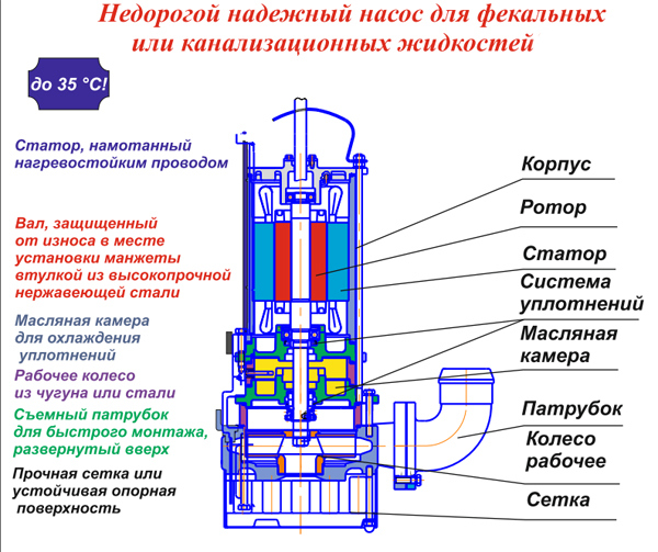 Les pompes sont installées dans des fosses de drainage sans être complètement immergées dans l'eau sale. Au-dessous du niveau, il y a une chambre de décharge, dans laquelle se trouve la roue à aubes, au-dessus du niveau, il y a un compartiment avec un moteur électrique. Par conséquent, un ventilateur est monté sur ce dernier, ce qui assure le refroidissement de l'appareil.