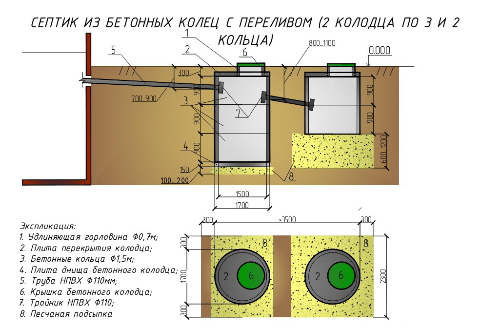 Par exemple, si les anneaux sont sélectionnés KS 20-9, le volume d'un élément est de 2,8 m³... Autrement dit, pour une maison où vivent 3 personnes, une bague est plus que suffisante. Il n'est pas nécessaire de creuser une fosse profonde en dessous, autant que possible approfondit 70-80 cm... Cela simplifie les travaux de construction et réduit le budget. Par conséquent, il est très important d'effectuer d'abord tous les calculs, puis de procéder aux travaux de construction et à l'acquisition de matériaux.