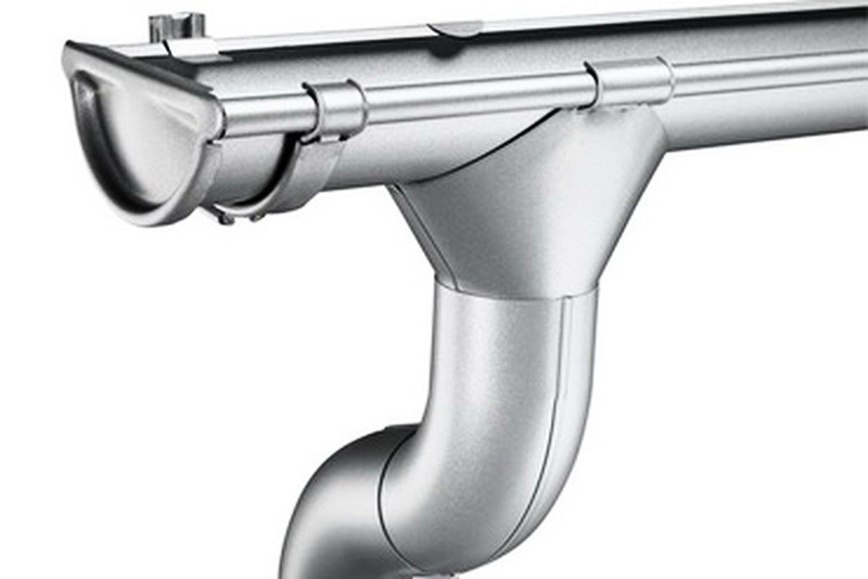 - Les gouttes en aluminium de fabrication industrielle sont laquées ou peintes en permanence. Posséder une résistance suffisante aux influences naturelles négatives. Les éléments sont rivetés à l'aide d'un mastic. Vous pouvez économiser de l'argent en assemblant le système de drainage à partir de tôles et en les pliant sur le site d'installation.