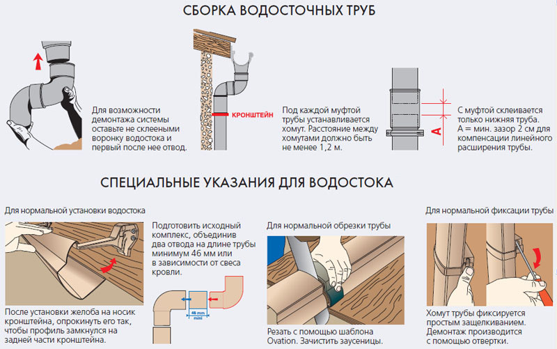 Contrairement aux tuyaux métalliques, les tuyaux en PVC ne créent pas de bruit pendant le processus de drainage. La résistance mécanique des gouttes en PVC est assez élevée, à condition que les règles d'installation du système soient respectées. Une large gamme d'éléments de raccordement et de fixation, la présence de tuyaux et de gouttières de différents diamètres, vous permettent de collecter des systèmes de drainage de configuration complexe.