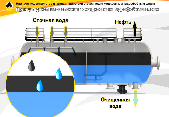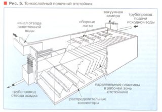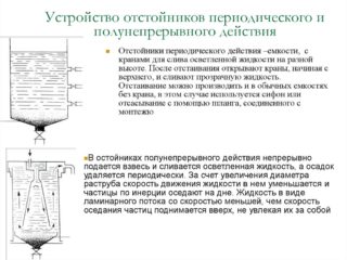 Le principe de fonctionnement consiste en l'alimentation continue du liquide d'origine et l'évacuation de l'eau clarifiée. Les boues perdues sont éliminées périodiquement. Pour augmenter la zone de dépôt, des structures à cloisons inclinées sont utilisées. Ils changent à plusieurs reprises la direction du flux de bas en haut et vice versa. Dans ce cas, le temps de séjour du liquide d'origine dans le réservoir augmente et une meilleure purification de l'eau est obtenue.
