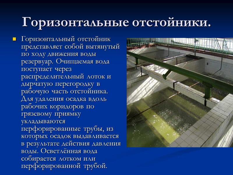 La conception du décanteur horizontal est un réservoir avec plusieurs couloirs. La division classique en hauteur distingue la zone de travail et la partie boues. Dans le premier, le processus de sédimentation a lieu, dans le second, les boues décantées sont récupérées. Selon les normes, une distance de 25 cm est prévue entre les zones.Les sédiments sont collectés dans une fosse au point d'entrée des eaux usées, d'où ils sont pompés par des pompes ou ratissés.