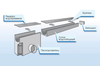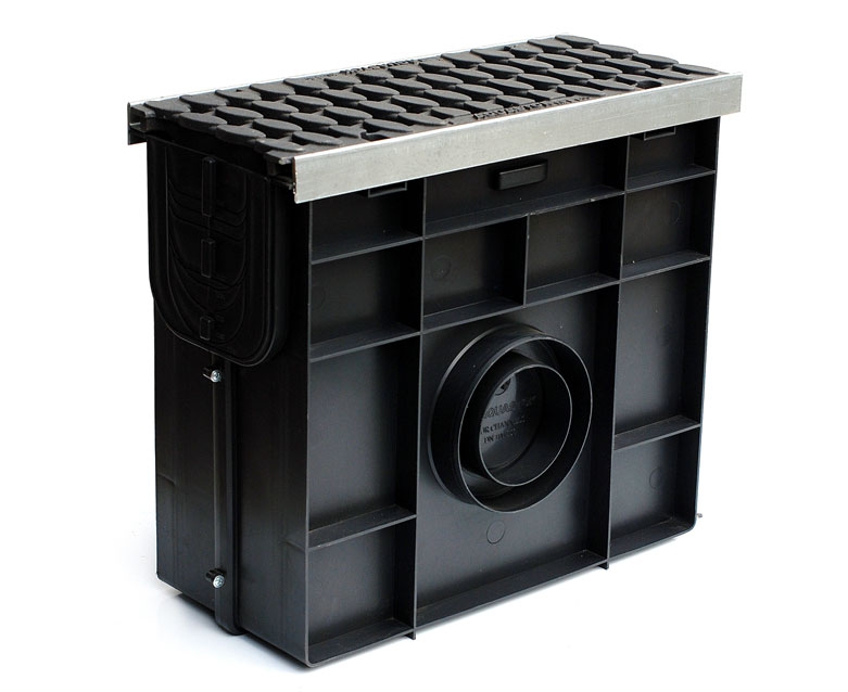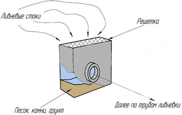 La poubelle est un conteneur fermé, qui se compose d'un récepteur sur le dessus, d'un fond, de tuyaux sur les côtés pour les tuyaux de raccordement et d'une grille. C'est une unité importante de l'égout pluvial : il recueille l'eau de la surface et la transfère plus loin le long des autoroutes après le nettoyage.