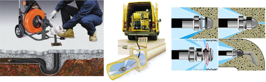 L'eau traverse le compresseur du réservoir dans un tuyau à haute pression, au bout duquel se trouve une buse percée de trous. Le trou dans le sens de la marche brise les blocages et évacue, et les trous à l'arrière de la buse déplacent toute la structure vers l'avant selon le principe de la poussée du jet et nettoient en même temps les parois du tuyau. De ce fait, les canalisations sont nettoyées sur toute la longueur du passage de la machine, et non à un endroit précis. Il existe des installations hydrauliques à usage domestique et industriel, le principe de fonctionnement est le même, la différence ne réside que dans la taille et les principes de connexion.