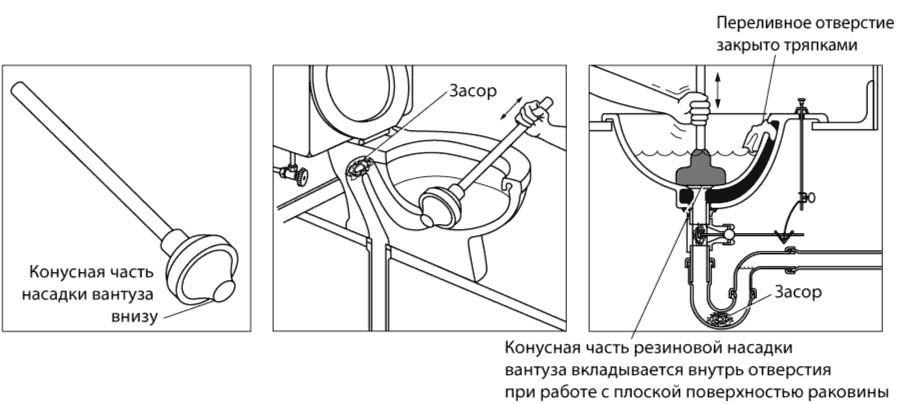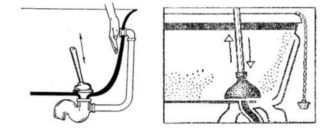 - pour une cuvette de toilette - le plus souvent une buse large incurvée est incluse dans l'ensemble général avec l'outil. Il entre juste étroitement dans le drain, bloquant la sortie d'eau de celui-ci.