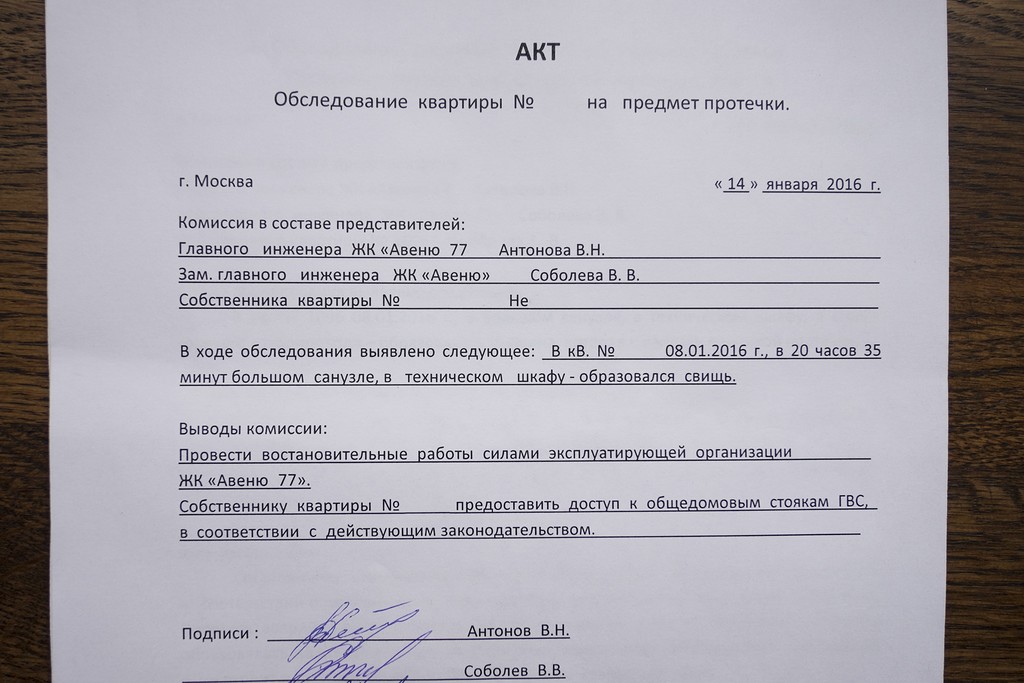 Une commission doit venir de l'office du logement de desserte à votre domicile pour inspection et rédaction d'un acte. Il comprend un chef mécanicien, un chef de chantier, un représentant de la société de gestion et un plombier. Le document doit contenir les informations suivantes :