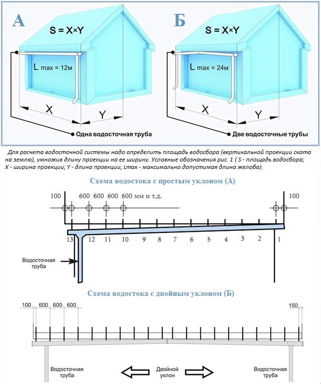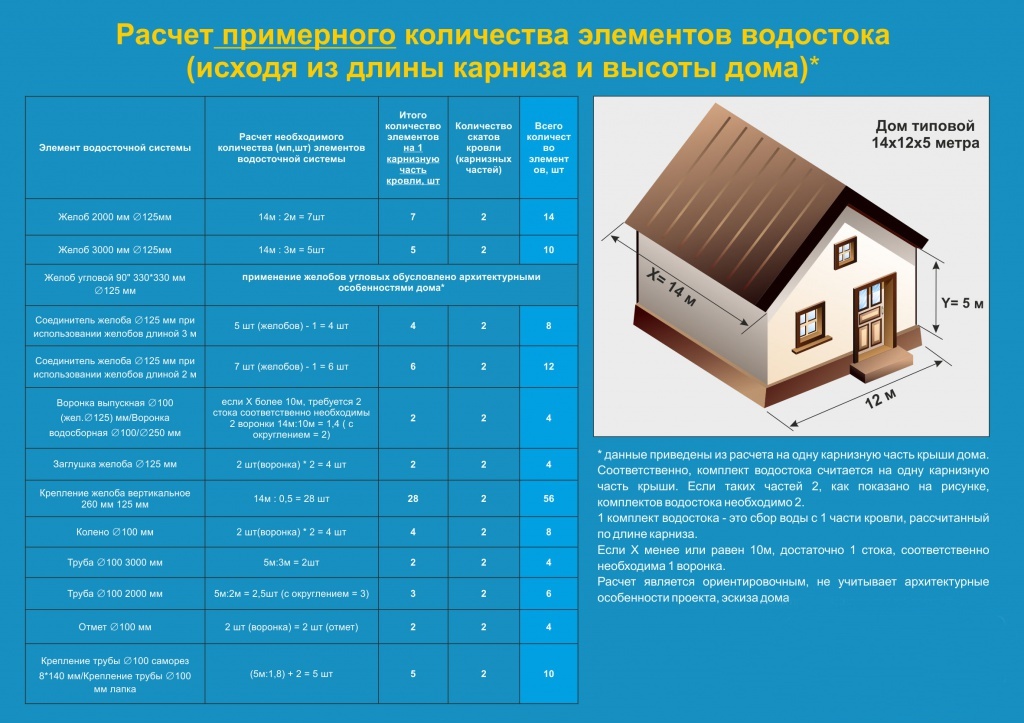 Le strict respect de la séquence de calculs vous permettra de savoir combien de tuyaux de drainage sur le toit et d'autres détails sont nécessaires. Lors du calcul, vous devez vous rappeler que chaque système de drainage est conçu pour une surface de toit ne dépassant pas 100 m². Il est recommandé d'installer des gouttières sur chaque pente.