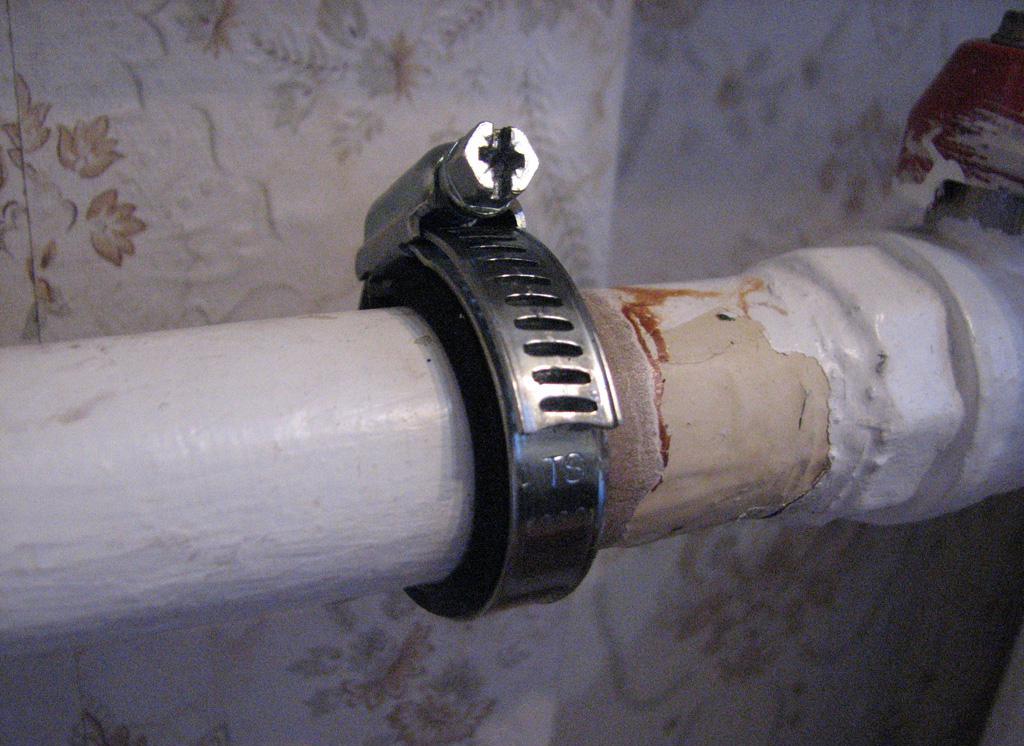 Vous pouvez vous débarrasser d'une fuite de toute complexité à l'aide de pinces. La zone où il est installé est prétraitée avec une brosse métallique ou du papier de verre, dégraissée avec un solvant. La zone défectueuse est enveloppée d'un joint spécial, un bandage en caoutchouc, après quoi une pince est appliquée. Pour fixer l'unité, les boulons et les écrous sont fermement serrés.