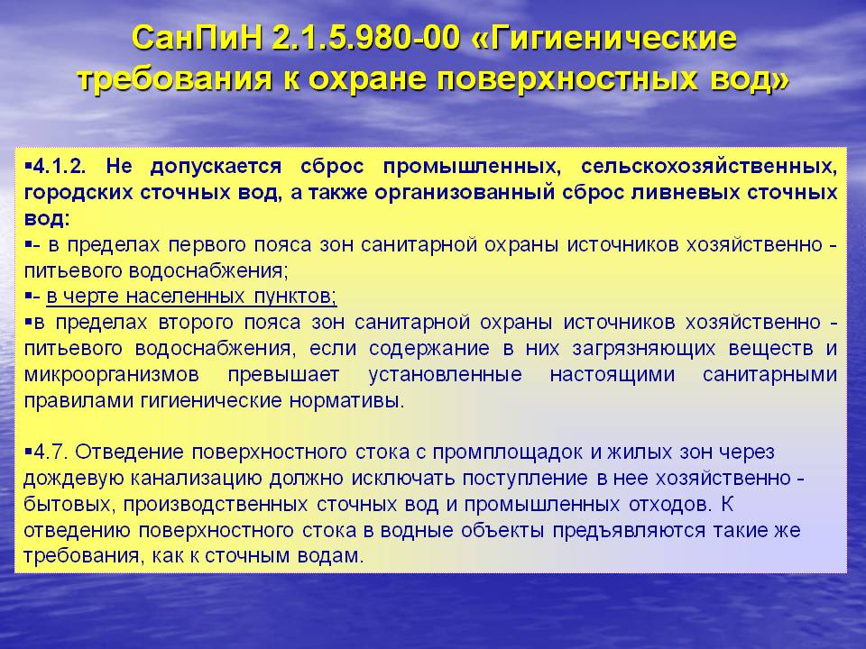 Le document principal contenant les règles de rejet des eaux usées est SanPiN 2.1.5.980-00. Selon lui, avant égouttage, la composition est vérifiée pour la teneur en contaminants et la présence de bactéries pathogènes. Une vérification est effectuée avec les indicateurs de la déclaration fournie par chaque entreprise sur les substances dangereuses dans les eaux usées.