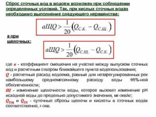 Dans les effluents dont le rejet est autorisé, la concentration maximale admissible d'impuretés (MPC) doit être prise en compte. Selon GOST - pas plus de 500 mg / l de suspensions et de substances flottantes. La température ne dépasse pas 40 degrés et le pH est de 6,5 à 9.