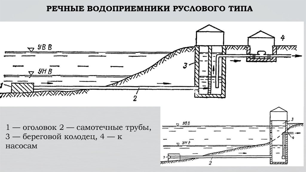 Pour le déversement des eaux usées traitées dans les plans d'eau, des sorties côtières, des canaux et des eaux profondes sont utilisées. Les premiers sont subdivisés en deux catégories : non immergés et immergés. Ces derniers sont des puits installés sur la rive avec évacuation des eaux usées sous le niveau d'une rivière ou d'un lac. Ceux qui ne sont pas inondés combinent les cours d'eau sous un certain angle. Les sorties profondes fournissent une décharge à haut volume. Ils permettent d'éloigner le point de rejet de la côte.