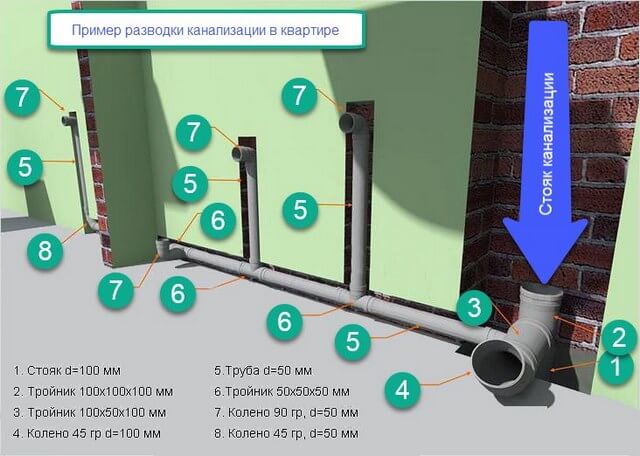 Les colonnes montantes collectent les drains de tous les appareils de plomberie situés à différents étages les uns sous les autres et ont une continuation sur le toit sous la forme d'une cheminée - une girouette. Les colonnes montantes verticales sortent dans un collecteur horizontal de bâtiment commun avec une pente vers l'égout pour assurer le transport par gravité. Une canalisation d'égout de rue recueille les eaux usées qui sont tombées dans des puits d'inspection et les livre à la station d'épuration des eaux usées de la ville.
