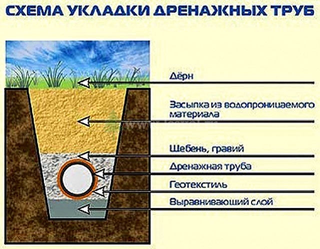 Vous devez d'abord creuser des tranchées pour installer des tuyaux de drainage. Ensuite, il est nécessaire de verser uniformément une couche de sable et de pierre concassée sur le fond afin que les communications ne s'affaissent pas ou ne se déforment pas. Exécutez toute la longueur des tuyaux et connectez-les avec des prises. Pour une meilleure étanchéité, il vaut la peine de recouvrir les joints d'une solution adhésive.