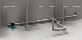 Les tuyaux sont posés selon le dessin, après avoir terminé les marquages sur les murs et le sol. Tout doit être fixé sur des pinces, des supports réglables et des supports. Fixé tous les mètres, mais au moins deux points par segment. L'accès aux révisions doit être prévu, le nettoyage avec un câble est pensé. Une seule pompe à pression est autorisée sur une ligne, c'est-à-dire que le lave-linge et le lave-vaisselle doivent avoir des entrées différentes dans la colonne montante.