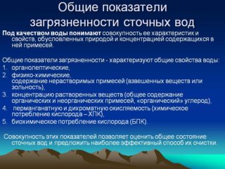 Des contaminants conservateurs et non conservateurs sont également émis dans les liquides. Les premiers n'entrent pas dans des réactions chimiques, ne se décomposent pas lors de la purification biologique. Les impuretés non conservatrices sont éliminées de l'effluent au moyen de bioprocédés autonettoyants.