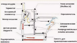 L'appareil est similaire à un placard sec travaillant sur des bactéries, mais au lieu d'un agent biologique, une chimie spéciale est utilisée. Il permet de transformer les déchets dans un dispositif de stockage en un mélange homogène et inodore.
