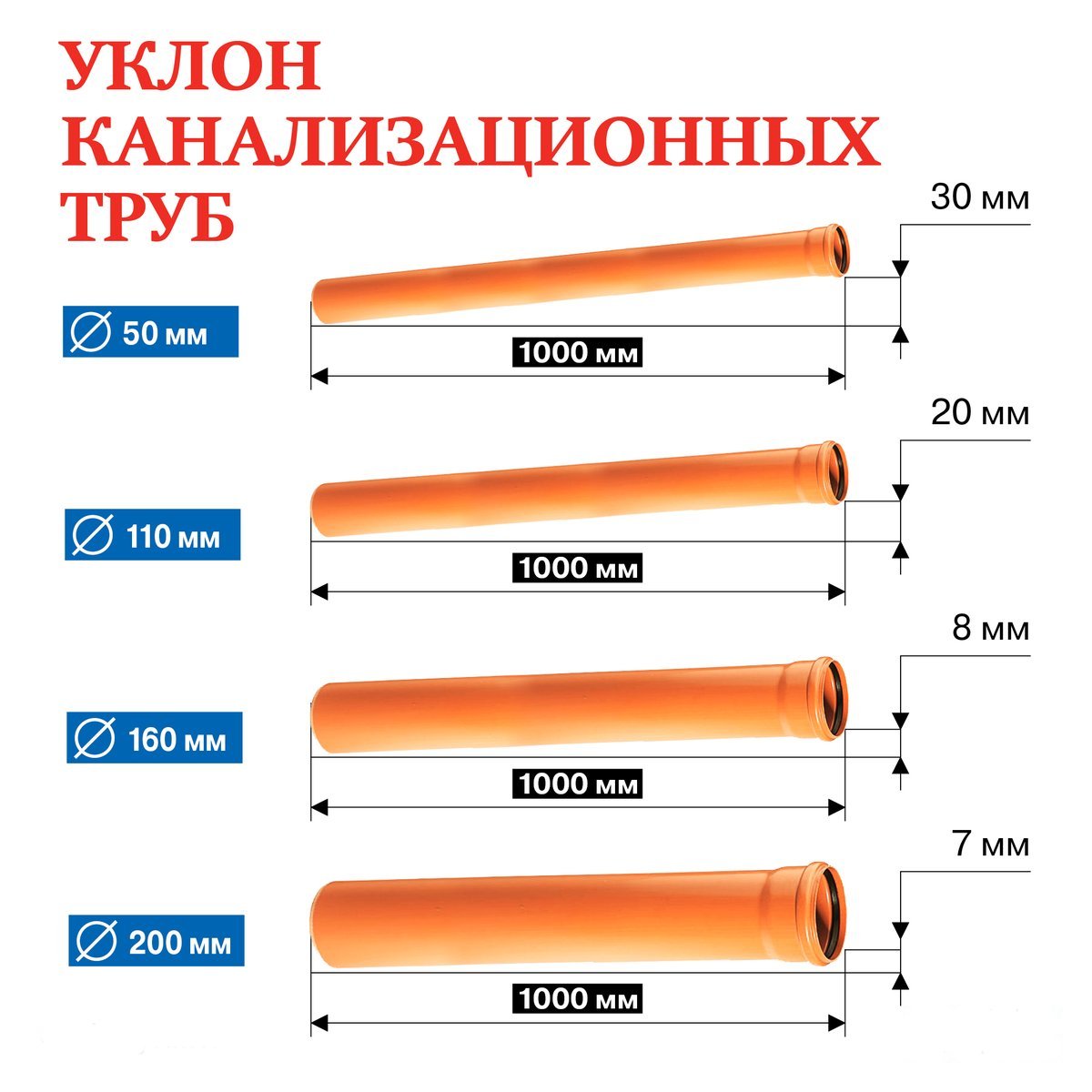 La pente du système d'égout est de 1 mètre selon SNiP pour chaque taille de tuyau :