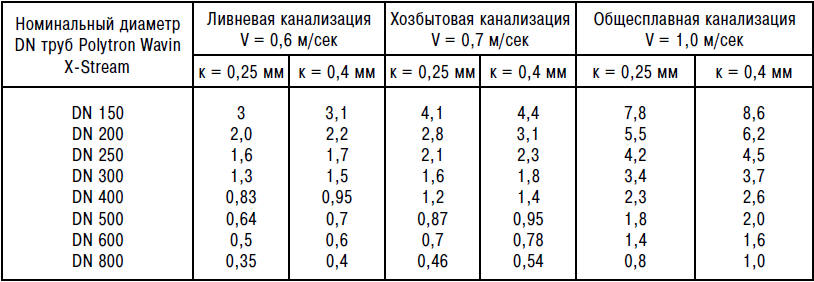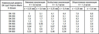 - coefficient (K) de rugosité et de résistance hydraulique de l'écoulement, qui pour les matériaux polymères est de 0,5, pour tous les autres - 0,6;