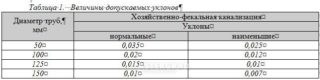 Il n'y a que deux erreurs dans la pente du tuyau : son manque ou son excès. Par conséquent, il est recommandé de se guider par les actes normatifs du SNiP, qui sont calculés pour chaque type de matériau et un certain diamètre.