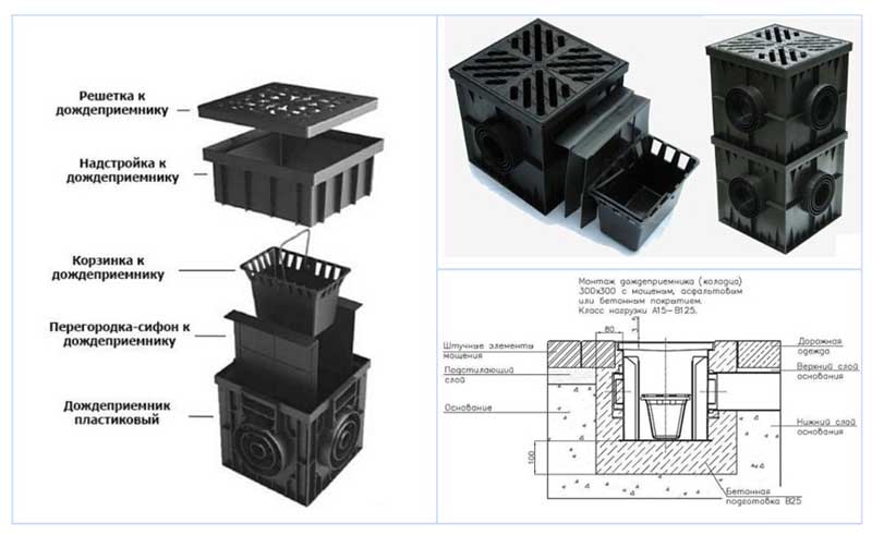 - Poids et type de matériel. Il convient de garder à l'esprit que les éléments en fonte sont interdits pour une utilisation dans les sols salins, sinon le sel abîmera le métal au fil du temps. Le plus souvent, dans la construction privée, des entrées d'eaux pluviales en plastique sont utilisées.
