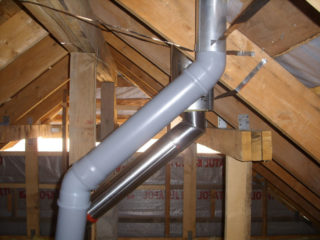 Le conduit de ventilation est également réalisé dans la structure finie. Le schéma de ventilation de la colonne montante d'égout dans une maison privée dans ce cas prévoit l'installation de tuyaux le long des murs du bâtiment.
