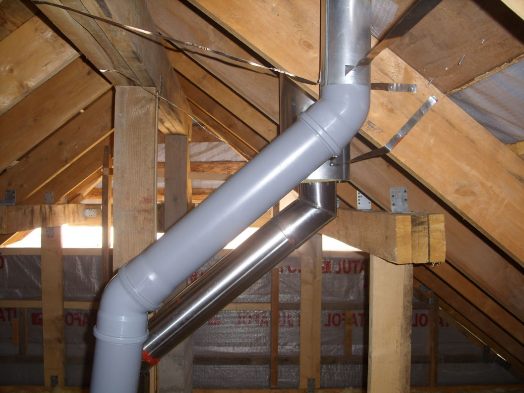 La hotte à l'intérieur de la maison est généralement fournie au stade de la conception. Pour cela, un puits de ventilation séparé est équipé. À l'extérieur, le tuyau est conduit à travers le toit du bâtiment jusqu'à une hauteur de 3 à 4 mètres au-dessus du niveau du sol.