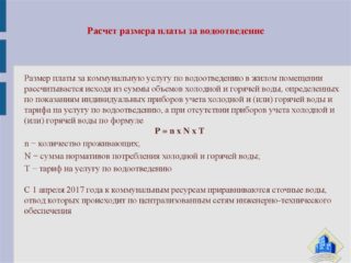S'il n'y a pas de compteur d'eau dans l'appartement, le montant du service d'assainissement est calculé sur la base des normes de consommation d'eau par personne établies pour une période déterminée. Selon la loi, ils sont différents pour chaque région et sont publiés dans les médias locaux.