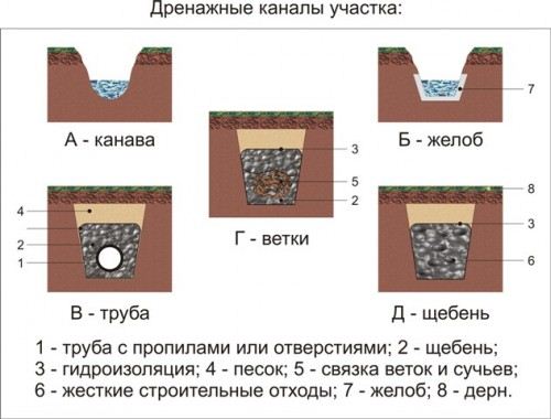En règle générale, les canaux ont une forme trapézoïdale, la profondeur est d'environ 0,7 m, la largeur est de 0,5 m. Les parois de la gouttière pour éviter l'éclatement sont faites avec une pente de 25 à 30 degrés, soigneusement compactées. Une fine couche de gravier fin ou de sable est versée sur le fond. La durée de vie du fossé peut être considérablement augmentée en renforçant les murs de diverses manières.