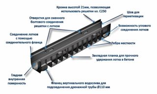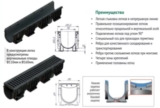 Des bacs de drainage en plastique sont installés dans des canaux à surface dure pour collecter les eaux de fonte et de pluie et les rejeter dans les égouts pluviaux. Ils sont montés au ras du sol et sont recouverts de grilles qui empêchent les branches et les débris de pénétrer dans le système de nettoyage. Le dispositif d'arrivées d'eaux pluviales de ce type est constitué d'éléments distincts reliés hermétiquement entre eux.