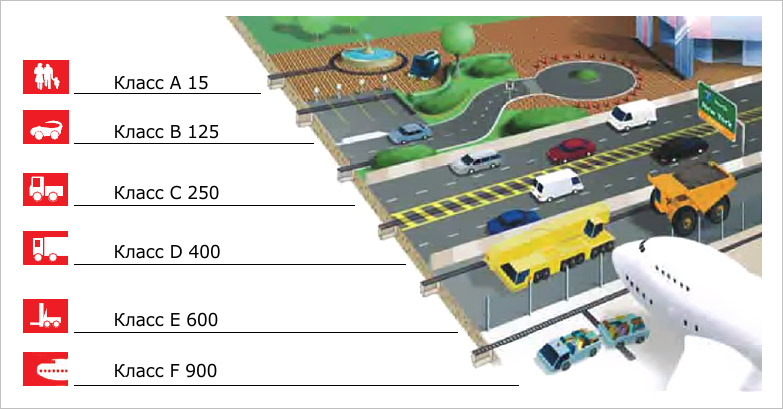 - B 125. Charge maximale jusqu'à 12,5 tonnes. Ils sont posés dans les parkings et dans les zones des routes de la ville.