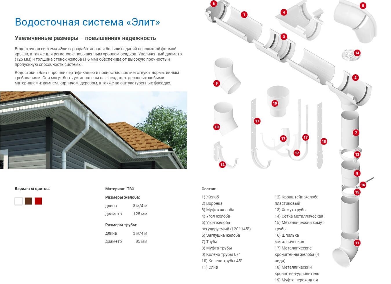 La série Elite est destinée aux chalets avec de grandes surfaces de toit. Il convient également à une petite maison, en particulier dans les régions réputées pour les averses et les chutes de neige. Les gouttières ont une capacité d'écoulement accrue en raison d'une grande section de gouttière (125 mm) et d'un tuyau global d'un diamètre de 95 mm. De plus, les éléments sont équipés de nervures de renforcement qui renforcent la résistance de la structure. Une étanchéité élevée est créée par des joints en caoutchouc spécialement conçus. Aucun silicone n'est nécessaire lors de la connexion des pièces.