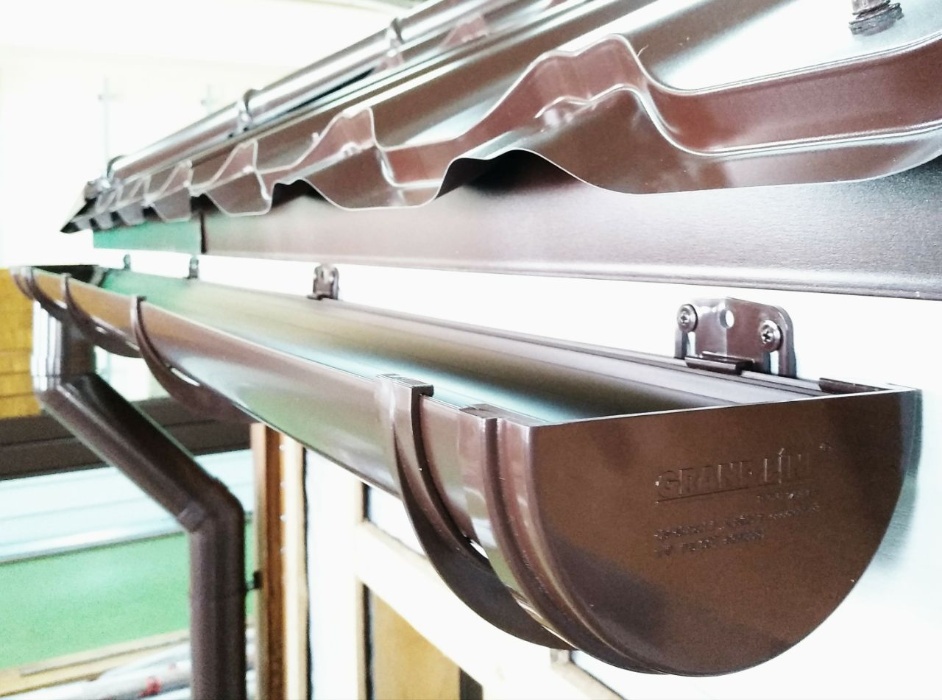Lors du choix d'une structure avec un revêtement polymère, le propriétaire d'une maison privée peut ne pas avoir peur des effets agressifs de l'environnement. La couche de protection galvanique d'Aluzinc surpasse même le plastique en termes de propriétés anti-corrosion et de résistance. Les éléments avec revêtement Aluzinc ont un lustre d'acier naturel et un motif original, ce qui facilite l'utilisation de ce type de gouttière pour des solutions de conception.