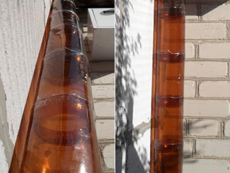 Il est tout à fait possible de réaliser des gouttières et des tuyaux de descente à partir de bouteilles en plastique. Ils dureront un an ou un peu plus. Mais avec un minimum d'investissement en espèces, cette option aidera à faire face à l'excès d'humidité hors saison.