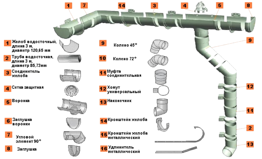 Le système est assemblé de haut en bas. D'abord, les gouttières sont suspendues, puis les tuyaux de descente. La distance entre le tuyau et le mur est d'au moins 10 cm.Les joints de gouttière sont fixés avec des vis autotaraudeuses et du mastic.