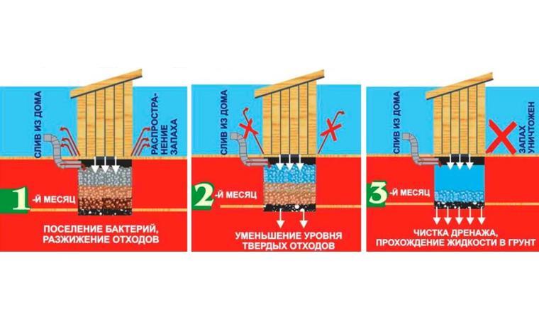 - Pendant la saison chaude, il est préférable d'utiliser des bactéries. Ils élimineront non seulement les couches de graisse sur les parois et le fond de la fosse, mais élimineront également les odeurs désagréables. De plus, le pompage peut être effectué moins fréquemment.