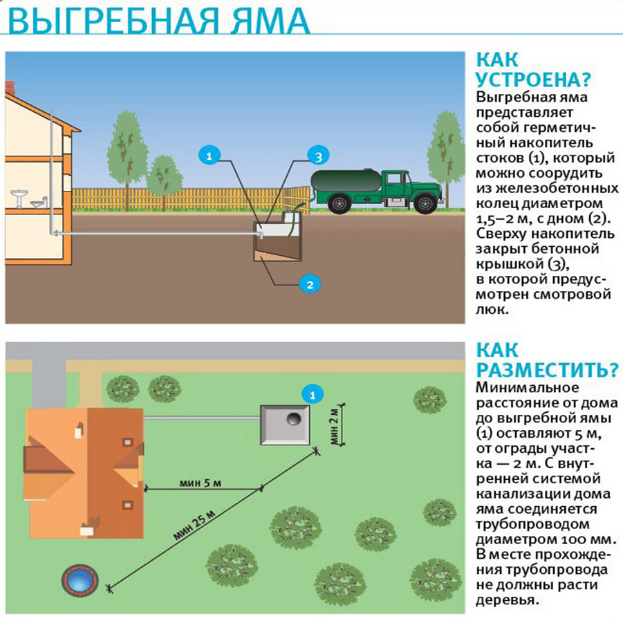 Le puisard doit être situé à une distance de plus de 10 mètres des bâtiments résidentiels, à au moins 25 mètres de la source d'eau potable. Vous ne pouvez pas faire de fosse septique à l'endroit le plus bas du site - au printemps, elle peut être inondée. Il est important qu'une machine de pompage puisse conduire jusqu'à la fosse septique.