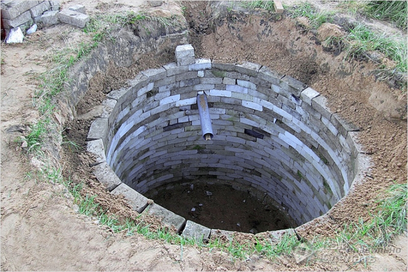 - La maçonnerie des murs est réalisée. Le collecteur peut être rond, carré ou rectangulaire. La pose d'un conteneur scellé est réalisée avec un remplissage soigneux des joints avec un mortier ciment-sable. Pour la fabrication d'une fosse sans pompage, des fentes sont prévues pour l'infiltration de fluide entre les briques.