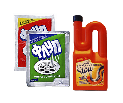 Le flup est produit en deux types - dans des emballages verts et rouges pesant chacun 60 g. Le produit dans l'emballage vert est versé avec de l'eau froide et dans le rouge - avec de l'eau chaude. Le produit n'est pas recommandé pour le nettoyage des toilettes.