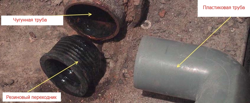 - Le tuyau de la longueur requise est coupé avec un coupe-tube ou une meuleuse, puis les chanfreins sont enlevés et nettoyés avec du papier de verre. Installez un adaptateur de la fonte au plastique dans la section de tuyau.