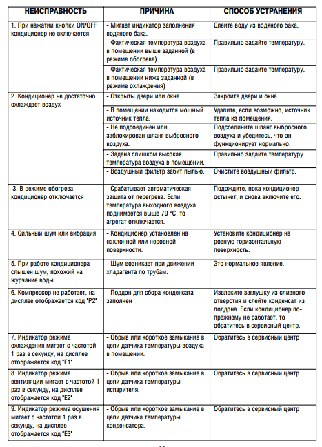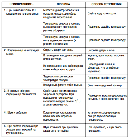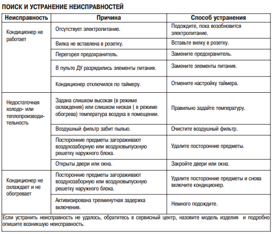 Les instructions ci-jointes répertorient tous les dysfonctionnements possibles dans le fonctionnement des climatiseurs, ainsi que les moyens de les éliminer. Les problèmes les plus courants associés au fonctionnement normal du système sont :
