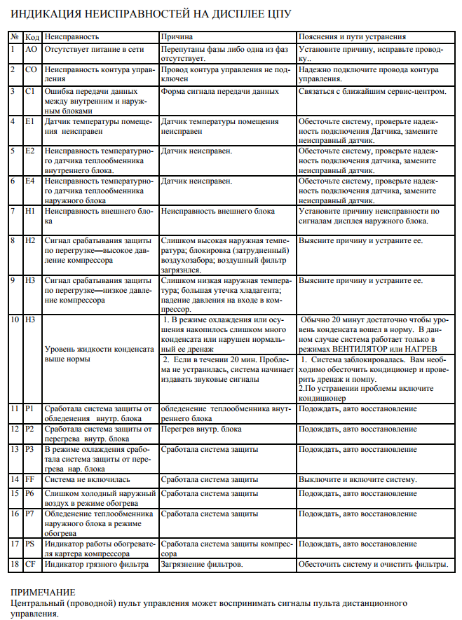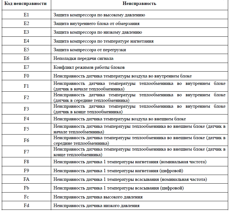 Le manuel d'utilisation contient une description des codes d'erreur pouvant survenir pendant le fonctionnement de l'équipement. Les codes sont initiés sur l'indicateur de l'unité intérieure et dupliqués sur la télécommande. Vous pouvez découvrir la signification du code dans les instructions :