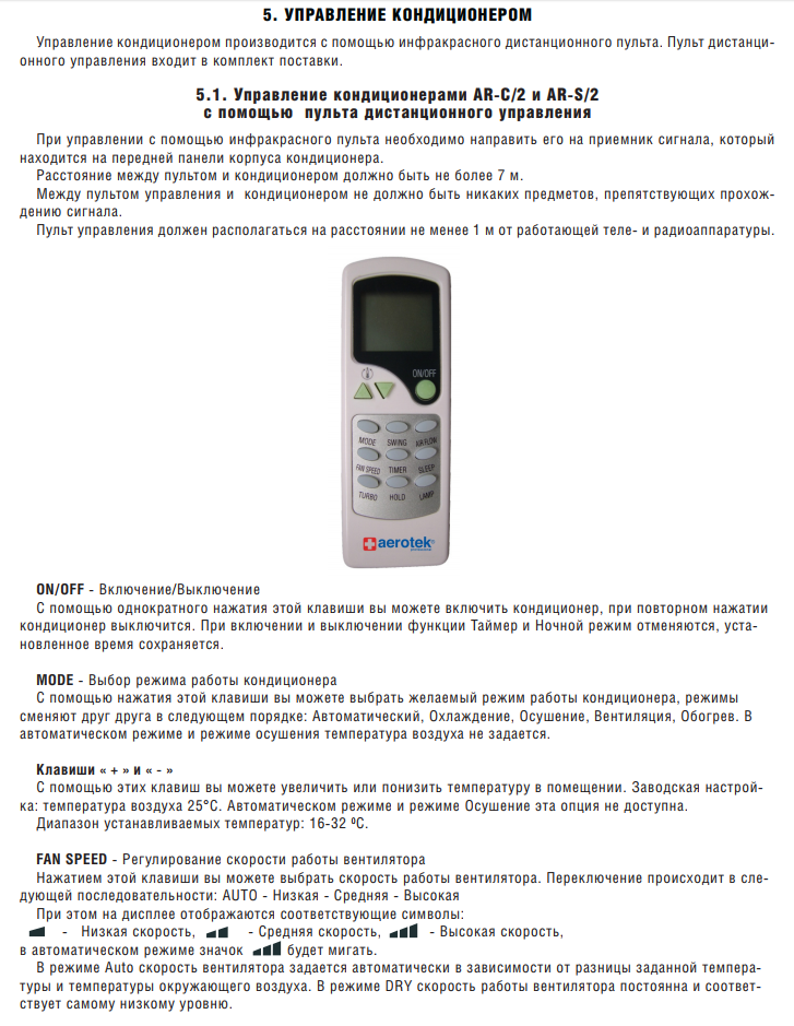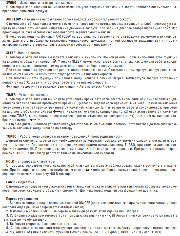 Aucun appareil technique n'est complet sans instructions. Un livret très détaillé avec toutes les règles d'installation et de fonctionnement du climatiseur est joint à chaque modèle, il est facile de les trouver sur Internet. Le manuel décrit à la fois les règles de sécurité de base, telles que l'importance d'une mise à la terre fiable de la prise ou la nécessité d'un nettoyage à sec régulier, et les principes de l'appareil. De plus, le manuel contient des instructions détaillées pour le panneau de commande. La partie principale du mode d'emploi est une description détaillée de chaque fonction. Voici quelques descriptions similaires de fonctions spéciales :