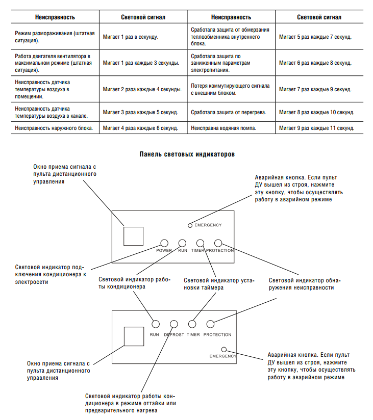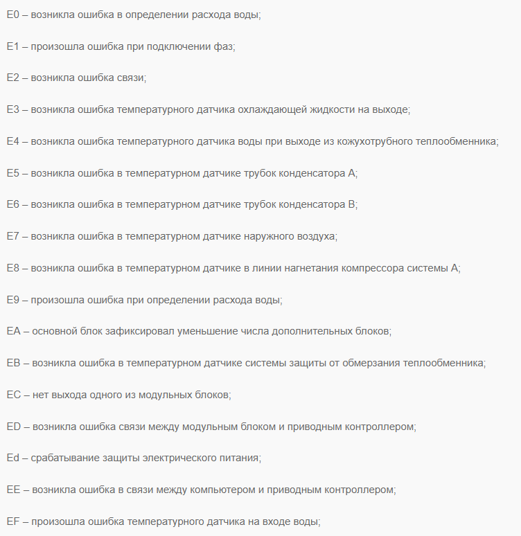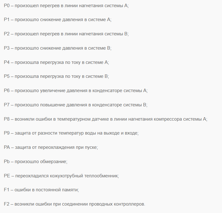 L'assistant principal de tout propriétaire du climatiseur après l'instruction est les codes d'erreur. C'est la connaissance du décodage des codes qui aidera à comprendre la cause de la panne, si elle survient soudainement. En standard, des caractères et des chiffres incompréhensibles sont affichés sur l'écran avant. Ce code devra être signalé au maître lorsqu'il sera nécessaire de réparer l'appareil, car il aidera à identifier la source du problème.