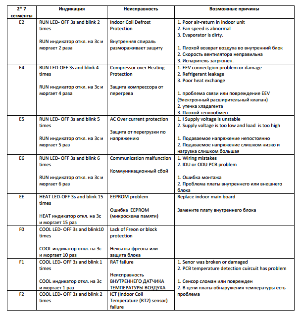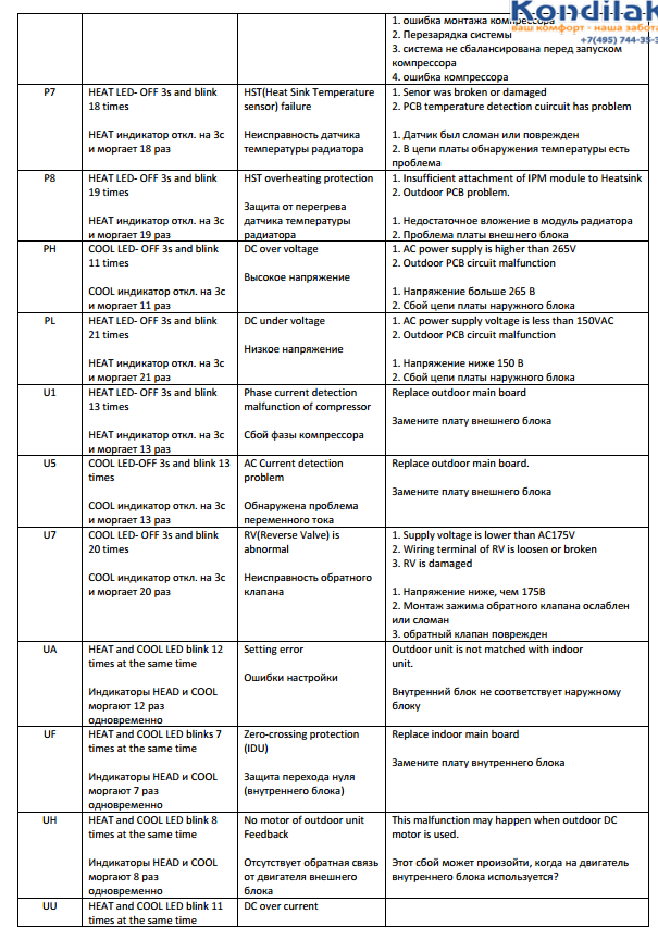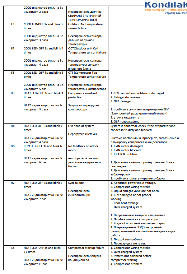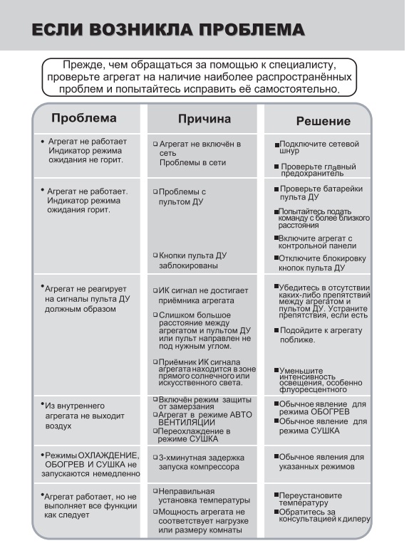 Le manuel d'accompagnement ne contient pas de codes d'erreur ; au lieu de cela, les causes fréquentes de dysfonctionnement ou de défaillance du système sont décrites en détail. Ils sont principalement associés à une mauvaise installation ou maintenance du climatiseur. Si les erreurs sont systématiques et ne sont pas éliminées après les étapes décrites ci-dessous, une réparation professionnelle sera requise.