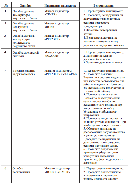 Les climatiseurs sont équipés d'un système d'autodiagnostic et de protection. L'appareil détecte les indicateurs extrêmes - gel, surchauffe et active la fonction correspondante - il peut activer le dégivrage automatique si l'échangeur de chaleur externe gèle, ou l'empêcher de geler. Il s'allumera automatiquement dans le mode précédemment défini après une panne de courant.