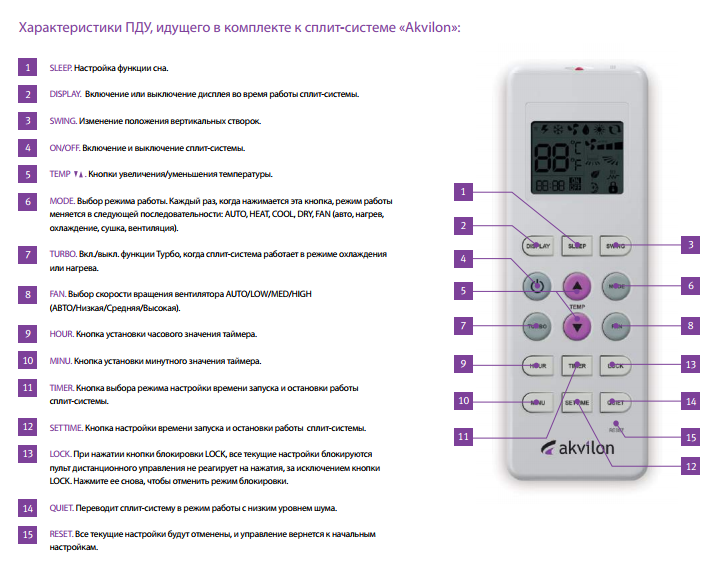 Ici, la description des quatre revendications est dirigée vers la télécommande. Ils s'habituent rapidement aux désignations étrangères sur les boutons, les gens sont plus gênés par le jingle, surtout la nuit, et la nécessité d'agir au toucher ou d'allumer la lumière pour appuyer sur les bons boutons. Il n'y a pas de plaintes importantes concernant les systèmes climatiques d'Akvilon eux-mêmes.