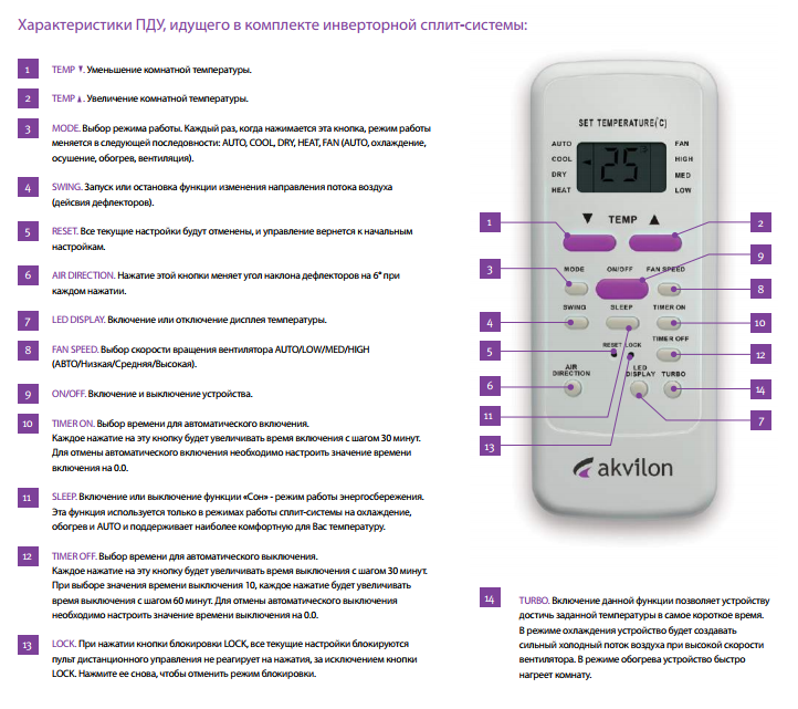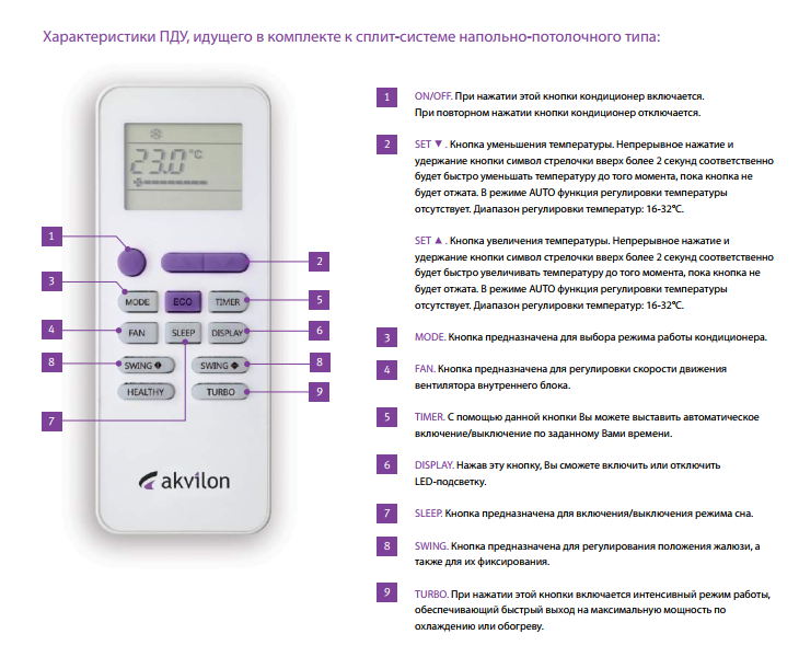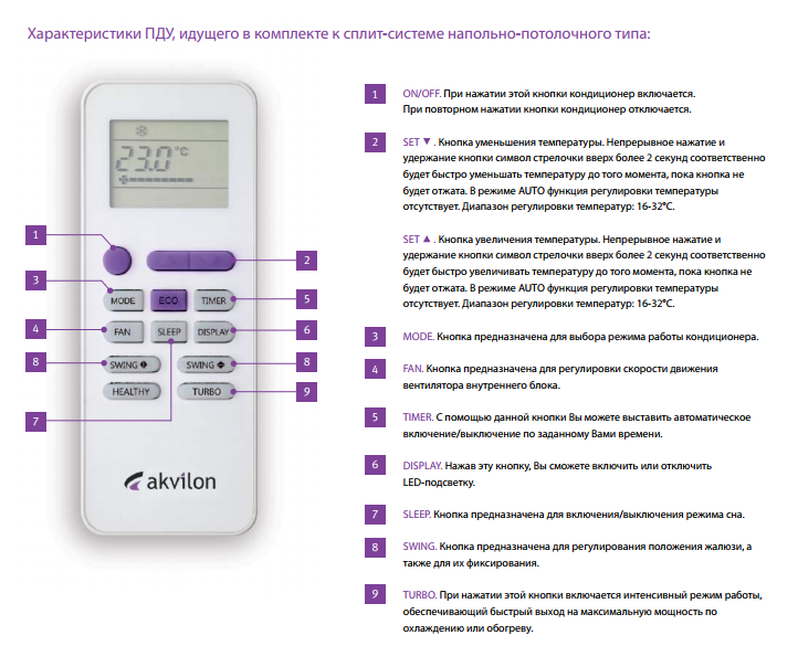 Les modèles ont une option "Turbo", lorsque le climatiseur prend rapidement la température de consigne. Une minuterie est fournie pour allumer et éteindre. Le panneau avant est en plastique blanc robuste. Les systèmes split Aquilon sont conçus pour fonctionner pendant 10 ans, la période de garantie pour les modèles est de 3 ans.