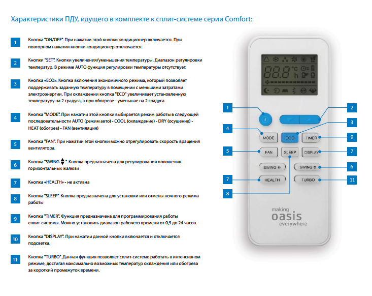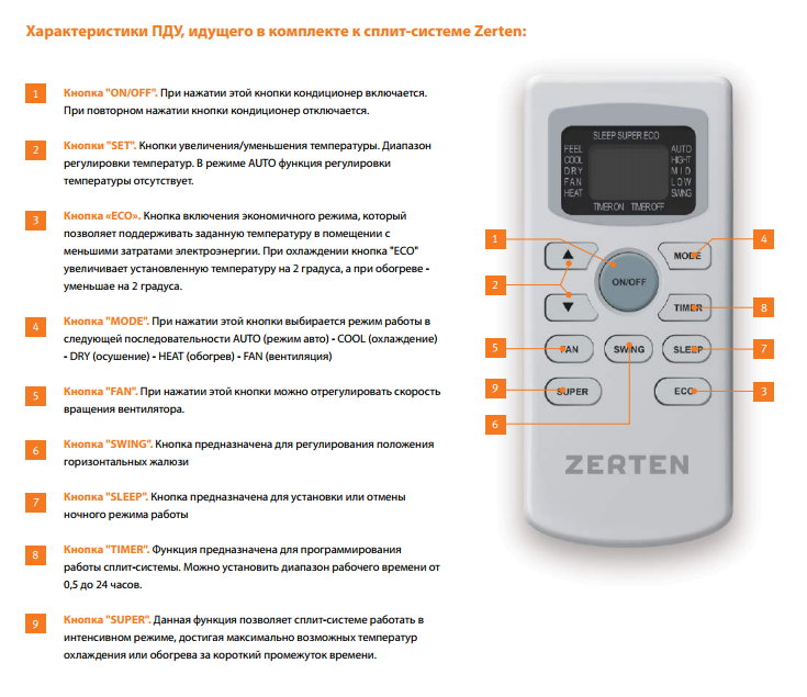 Et aussi d'autres options utiles - mode automatique et nuit, ventilation et minuterie, panneau de commande avec inscriptions en russe, faible niveau sonore et panneau externe antistatique.