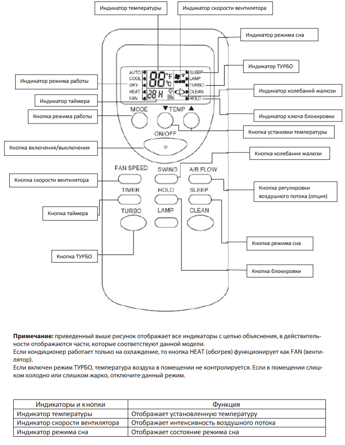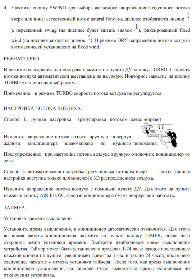 - Turbo... La vitesse de conditionnement est automatiquement réglée sur la valeur maximale. Il est nécessaire pour le refroidissement ou le chauffage opérationnel de la pièce, si une telle fonction est disponible.
